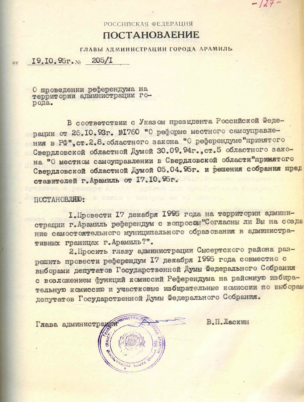 Ежегодно 21 апреля в России празднуется государственный праздник День местного самоуправления. В 2025 году самостоятельному муниципальному образованию Арамильский городской округ исполняется 30 лет. До середины 90-х годов прошлого века город Арамиль входил в состав Сысертского района. В октябре 1995 года Глава администрации города Арамиль и депутаты Арамильского городского собрания подписали ОБРАЩЕНИЕ к жителям, проживающим на территории, административно подчиненной городу Арамиль (город Арамиль, станция Арамиль, поселок Светлый), с вопросом: «Какой путь выбрать Арамильскому самоуправлению: стать самостоятельным или находиться в подчинении у района и надеяться на его благосклонность». Постановлением Главы администрации города Арамиль от 19 октября 1995 года № 205/1 решено на территории города Арамиль и подчиненных ему поселках: Арамиль и Светлый провести референдум о создании самостоятельного муниципального образования.